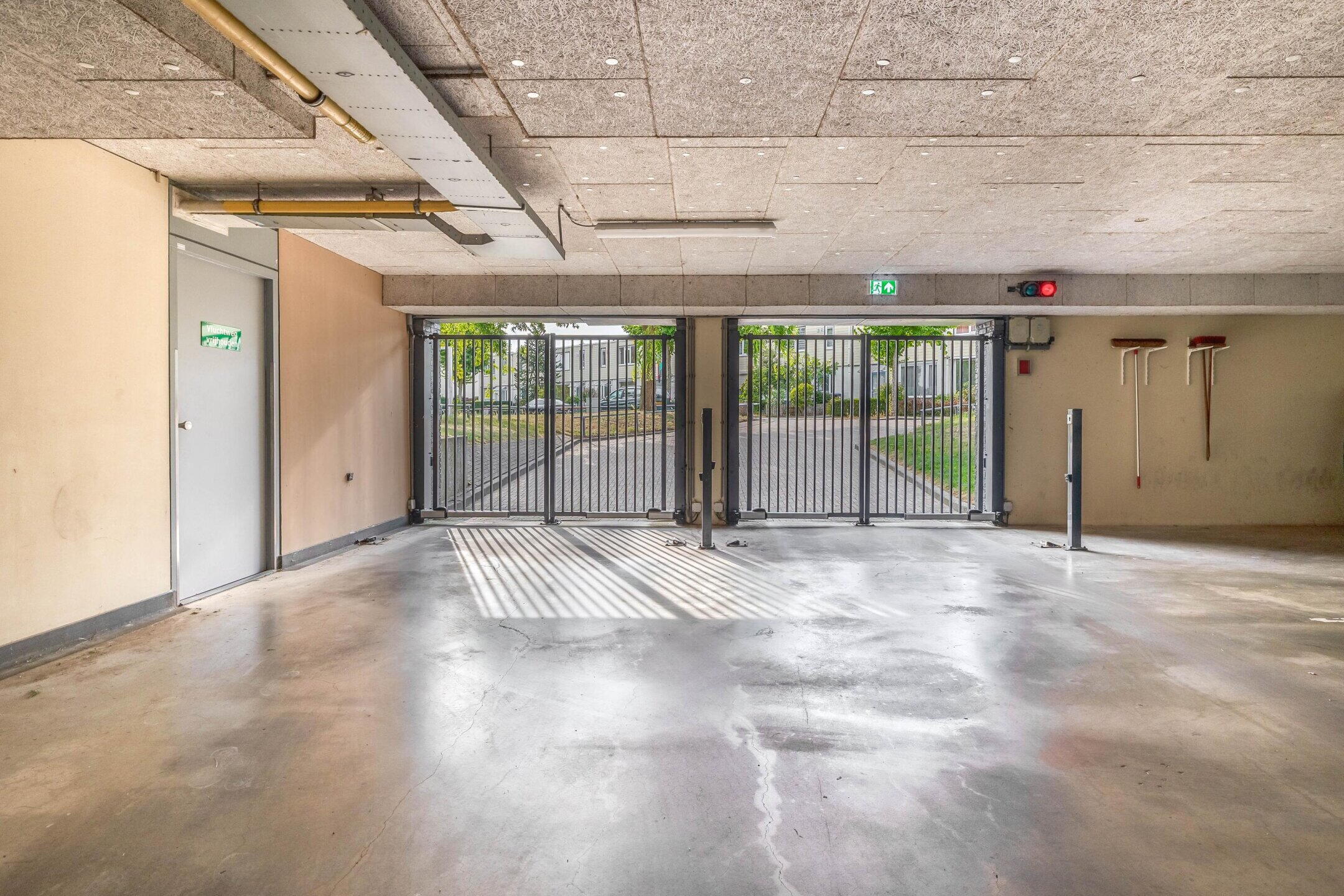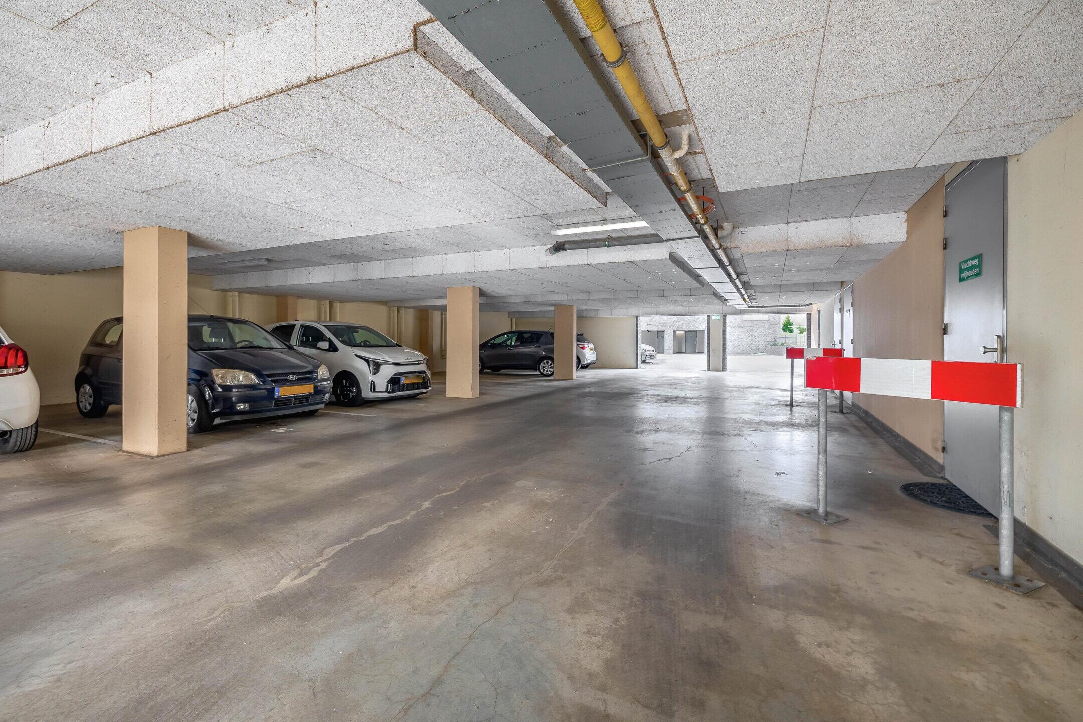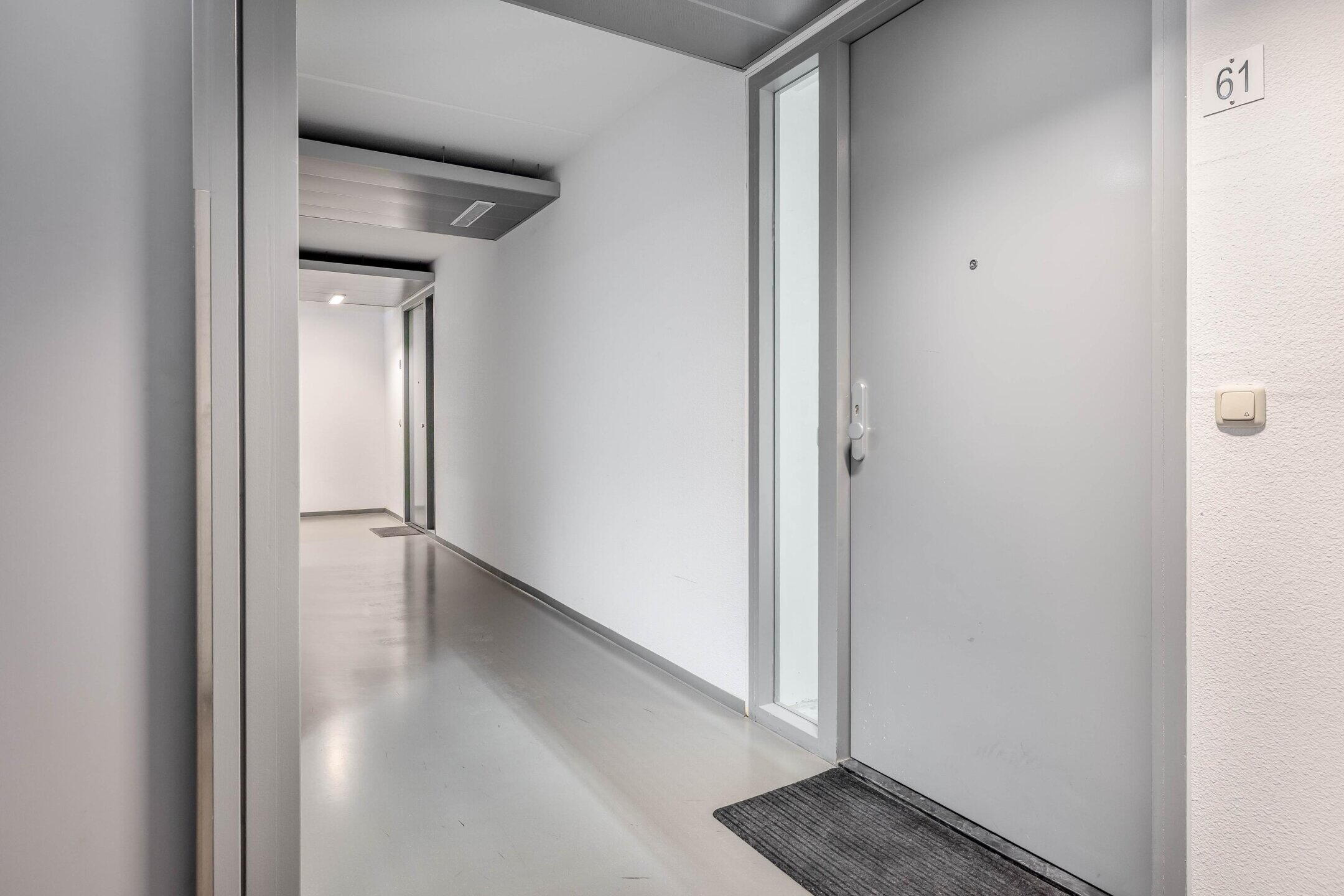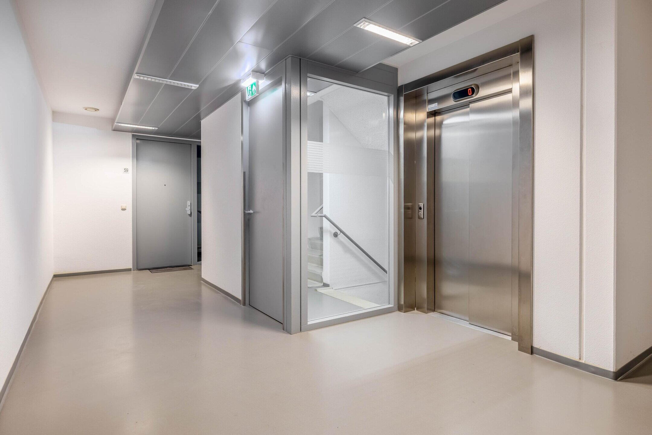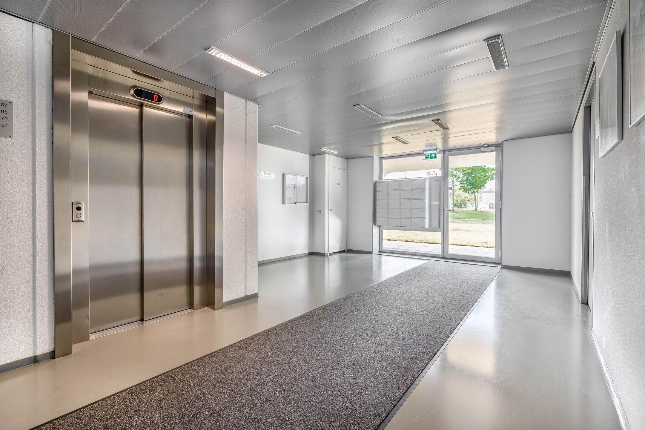 Overdekte entree, centrale hal met brievenkasten, ingang tot de bergingen, trappenhuis en lift.